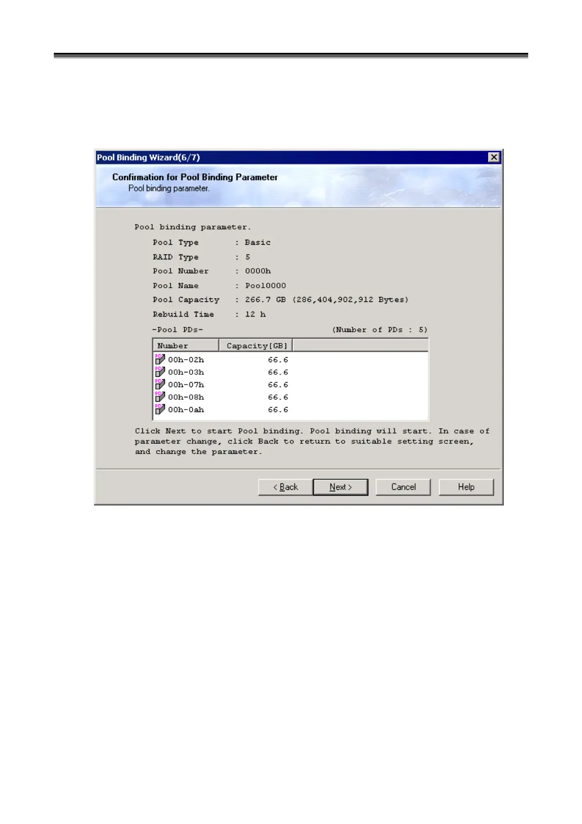 Clicking the [Next] button on the “Detail Parameter Setting for Pool Binding” screen displays the “Confirmation