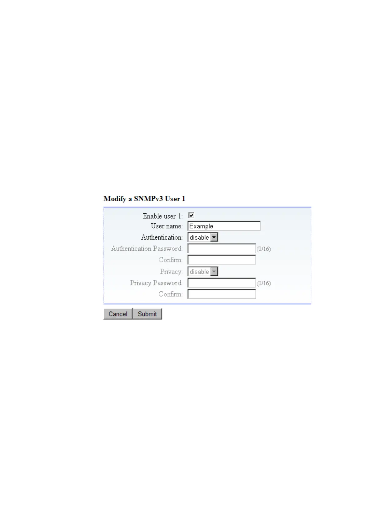 After setting “User name”, “Authentication” and “Privacy”, click “Submit" to register a new user.