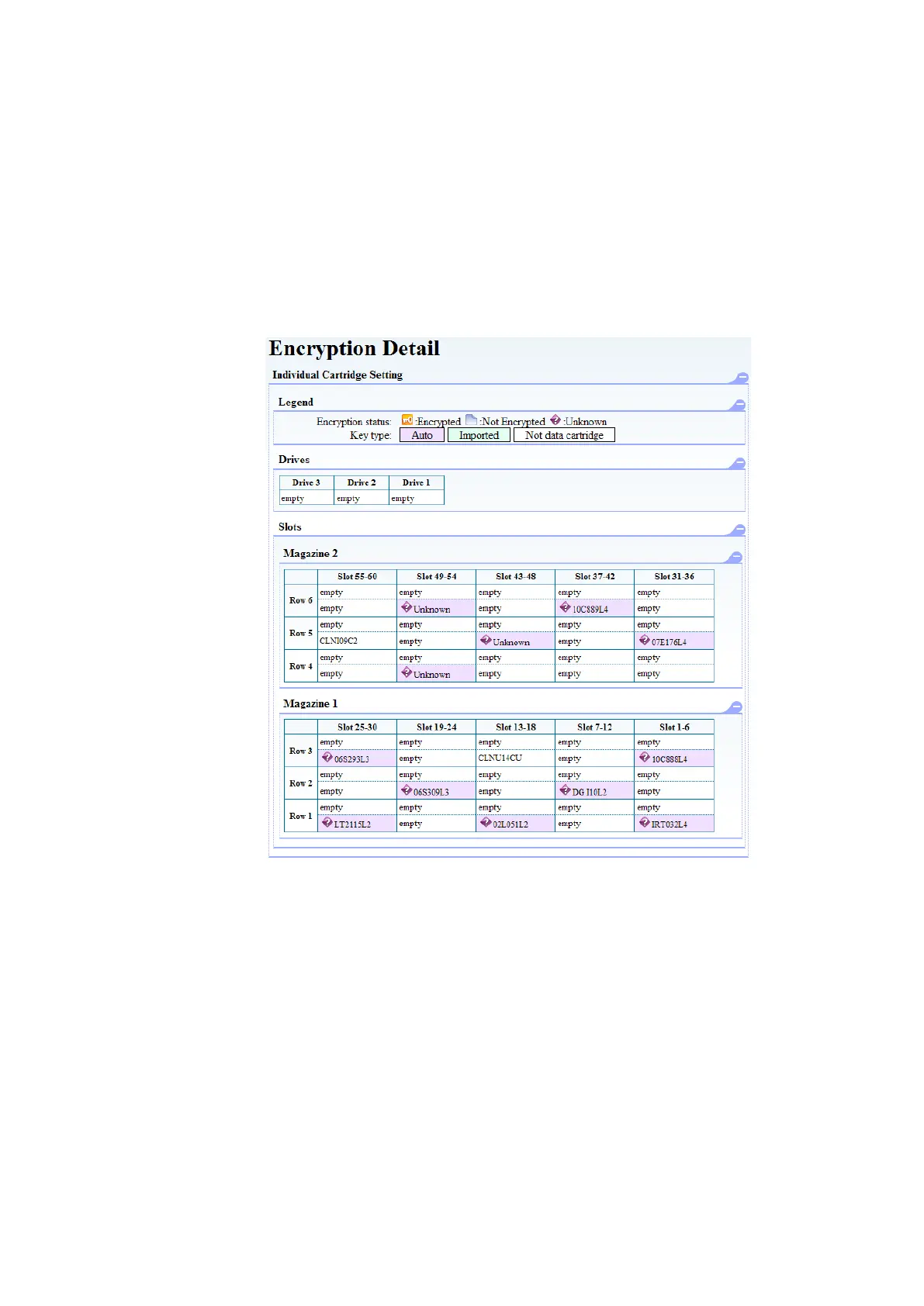 In the figure below, purple indicates that the tape medium in the slot is setting “auto” for Key