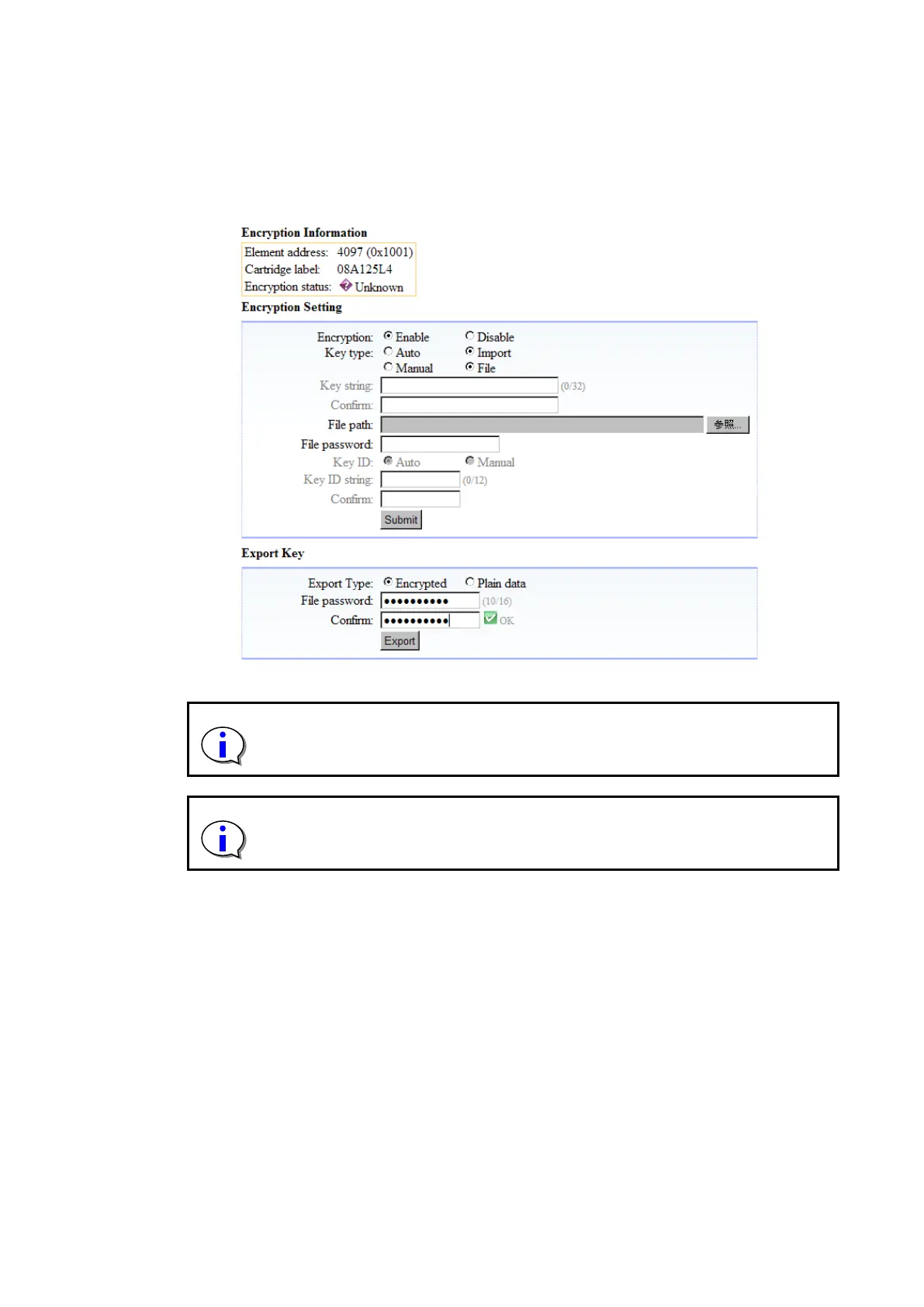 After selecting the exporting cartridge from Encryption Detail, the encryption key selects Export