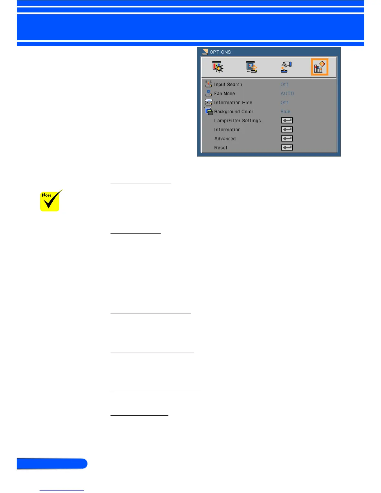 Use this feature to display a “Black”or “Blue” screen when no