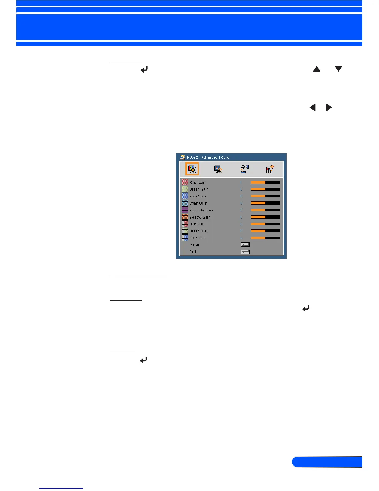 Bias/Cyan Gain/Magenta Gain/Yellow Gain: Use the or
