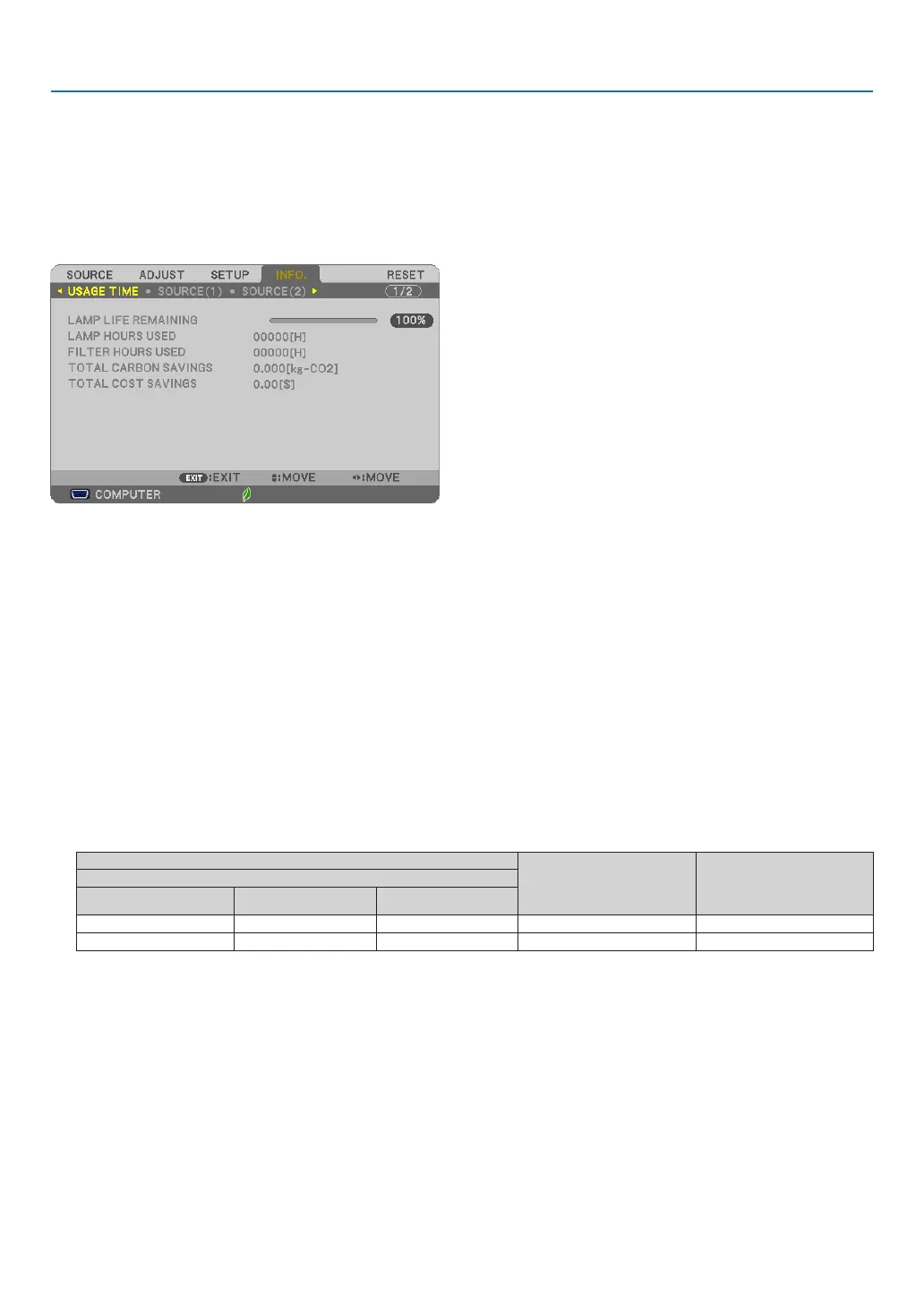 Thevalueinformsyouoftheamountoflampusage.Whentheremaininglamptimereaches0,theLAMPLIFE