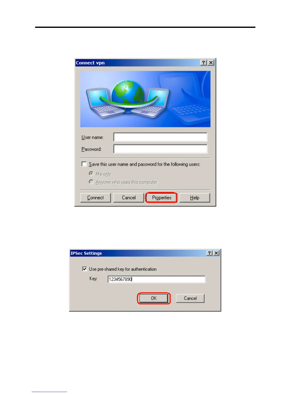 12. Click [Properties] on the [Connect vpn] dialog box.
