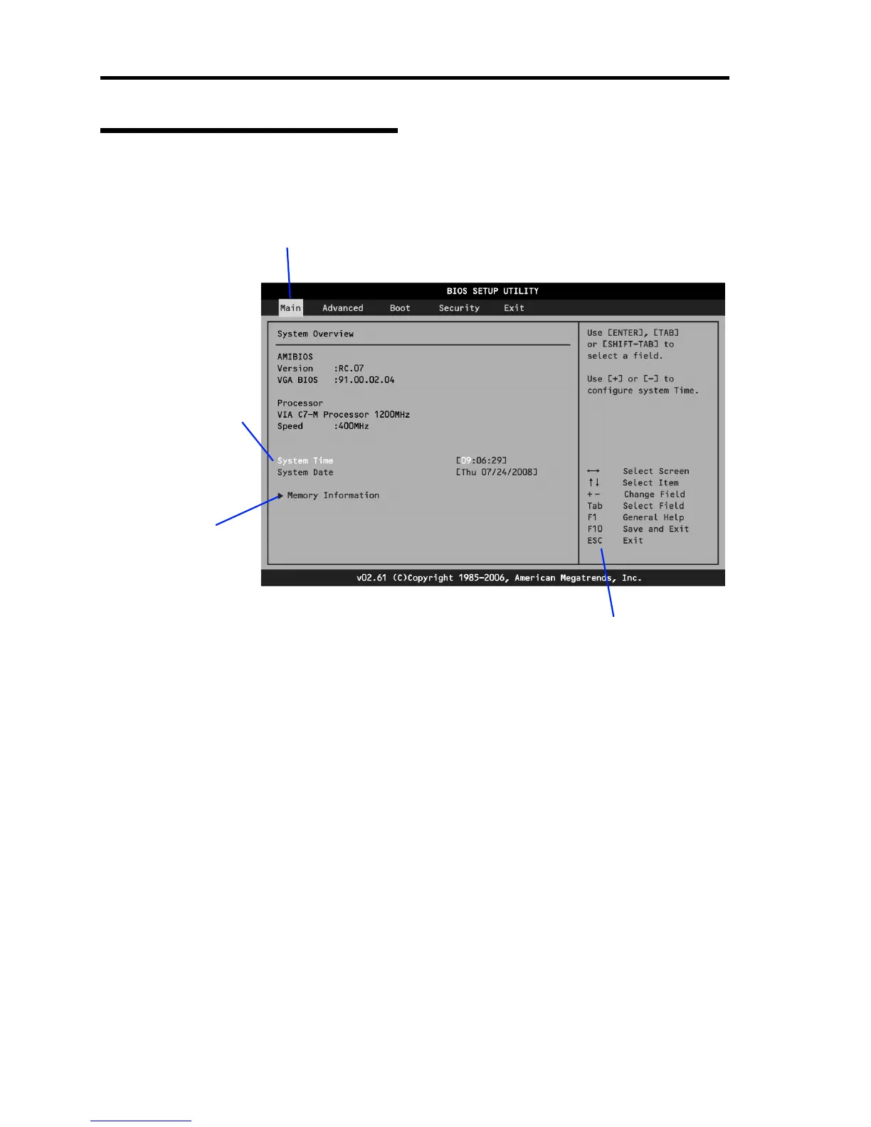Used to select a menu out of Main, Advanced, Boot, Security and Exit.