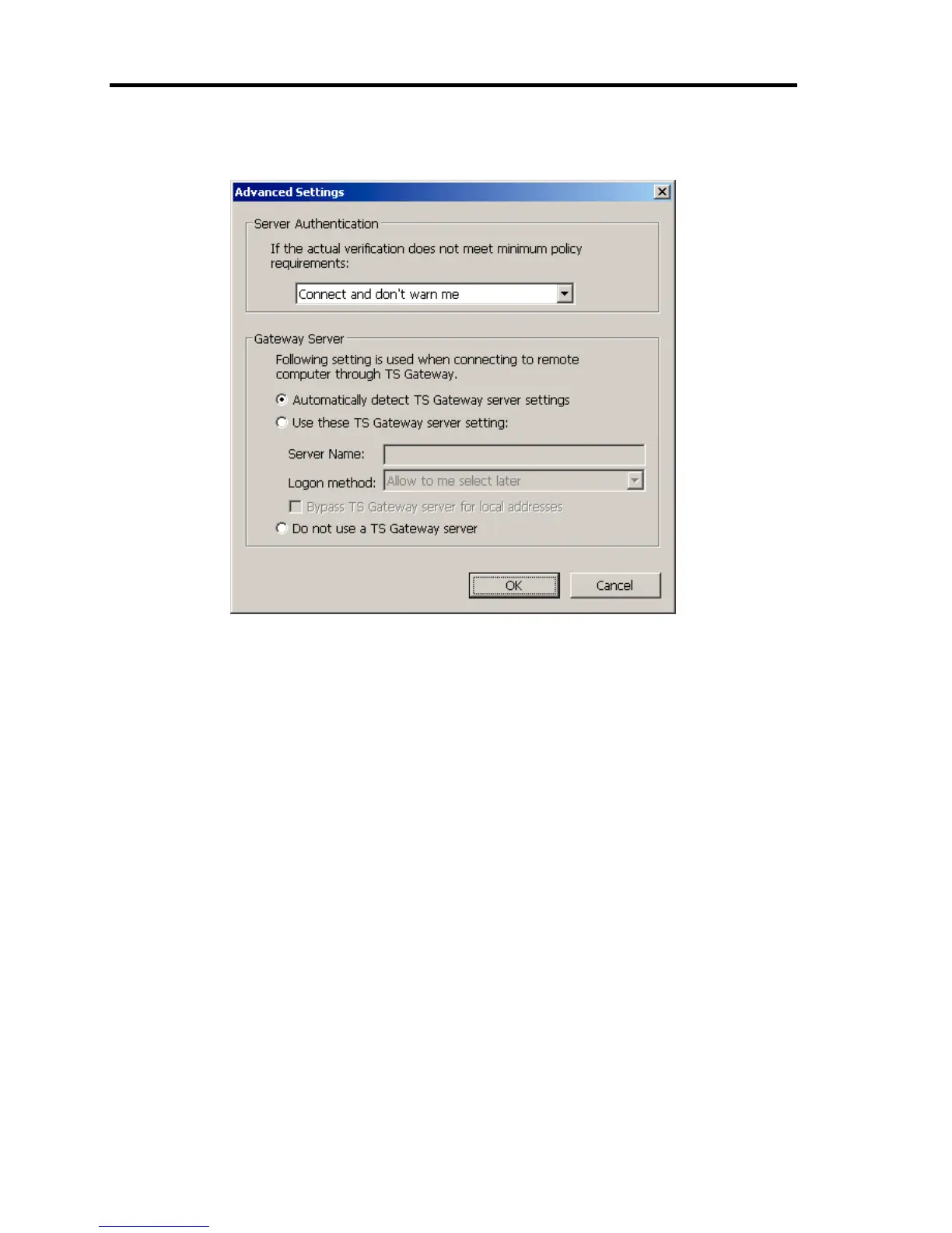To specify options for server authentication and TS gateway, click the [Advanced] button.