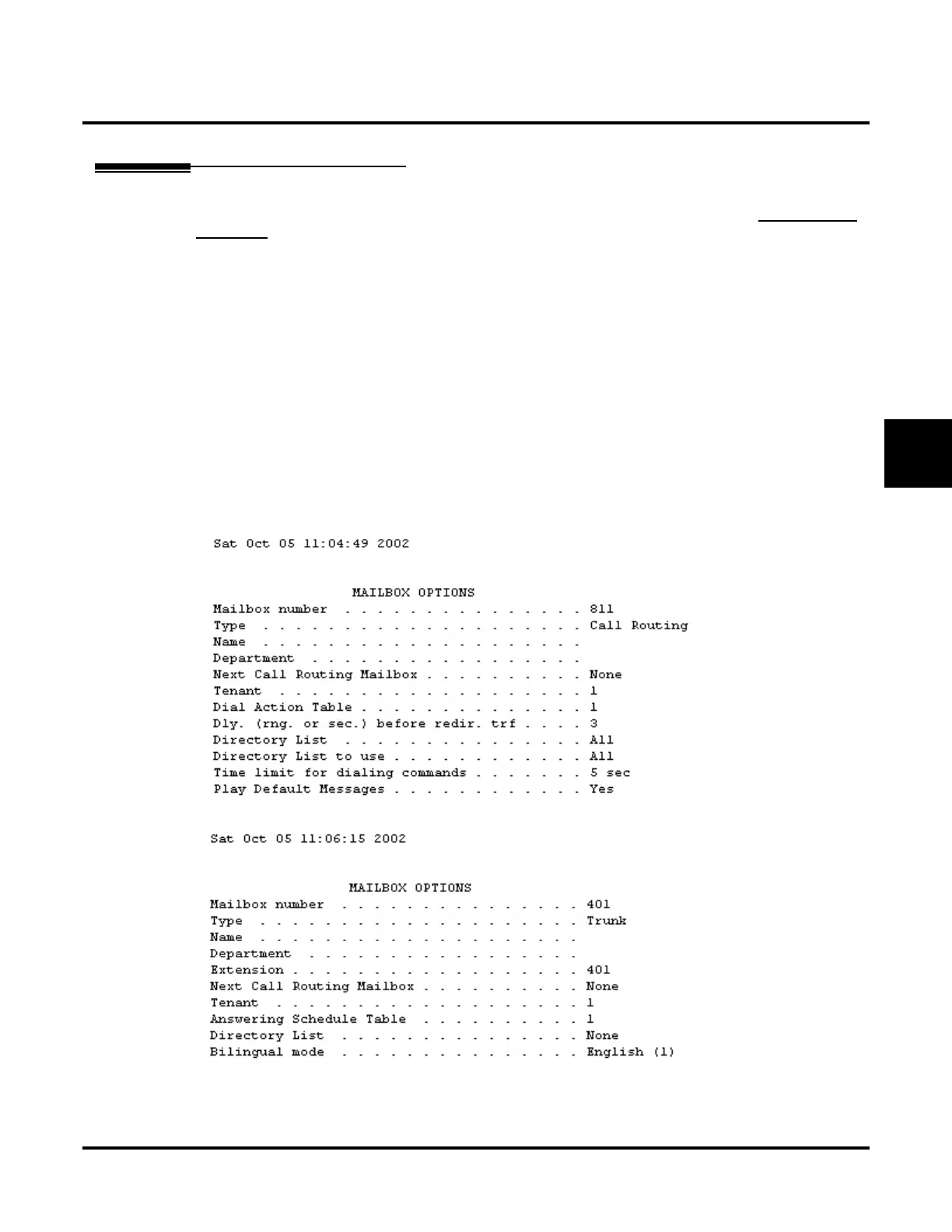 Use this report option to show the programming for each mailbox. All programming from CUSTOMIZE: MAIL-