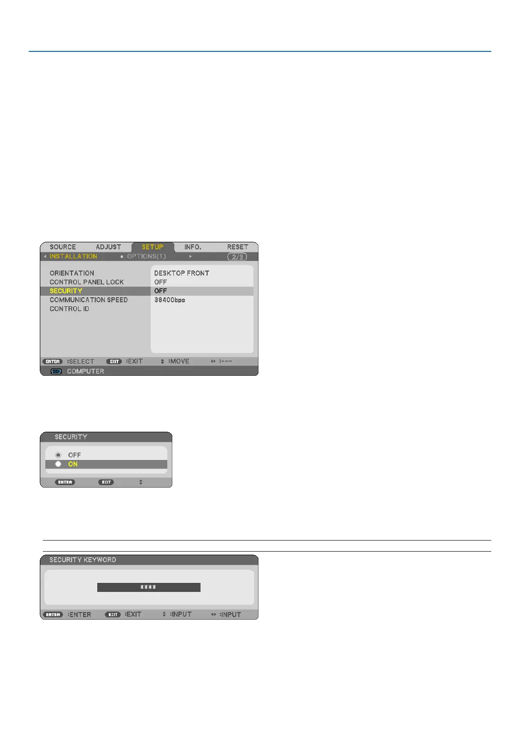 4. Press the button three times to select [SECURITY] and press the ENTER button.
