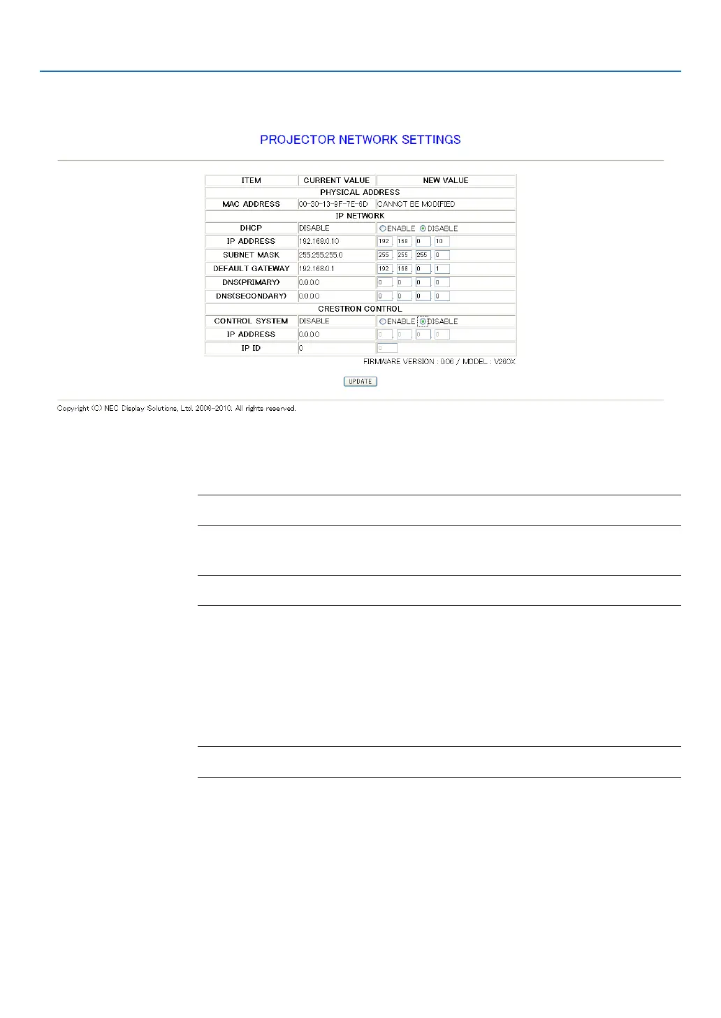IP ADDRESS .......................Set your IP address of the network connected to the projector when [DISABLE] is selected for