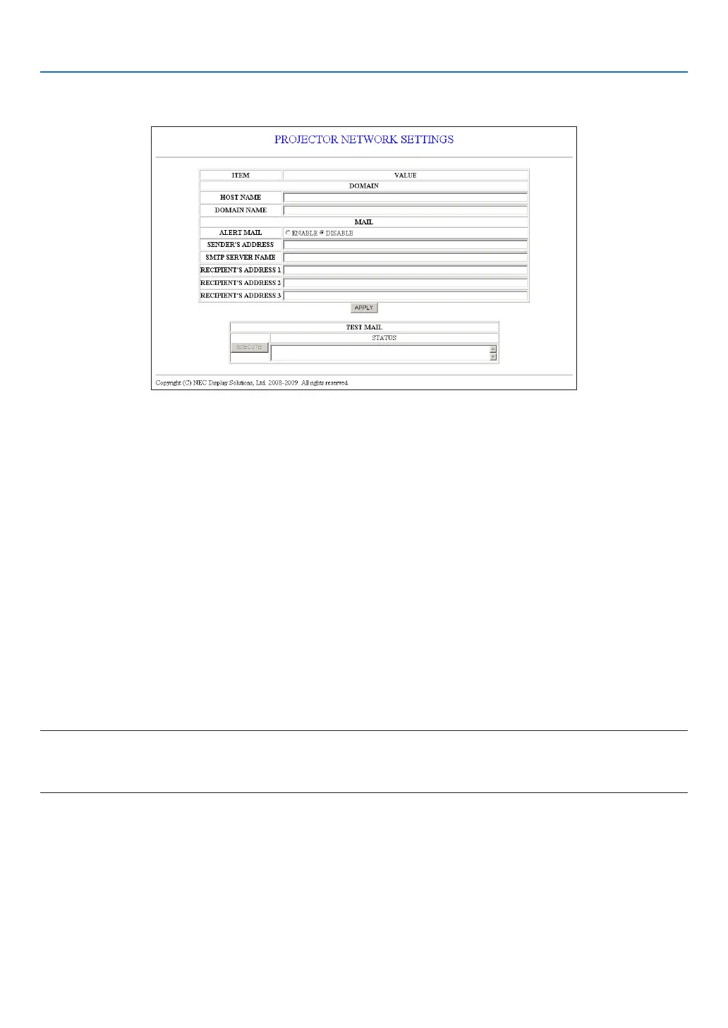 HOST NAME ............................ Type in the hostname of the network connected to the projector. Up to 60 alphanumeric char-