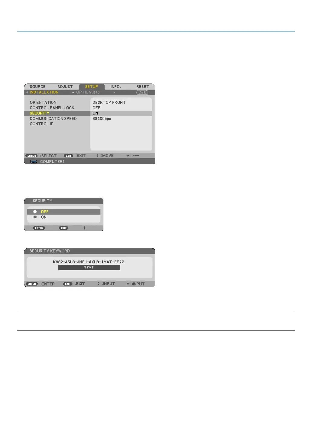 2. Select [SETUP] → [INSTALLATION] → [SECURITY] and press the ENTER button.