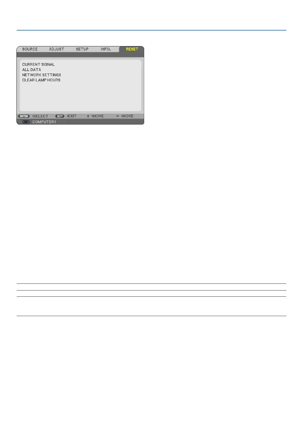 NOTE: Elapsed time of the lamp use will not be affected even when [RESET] is done from the menu.