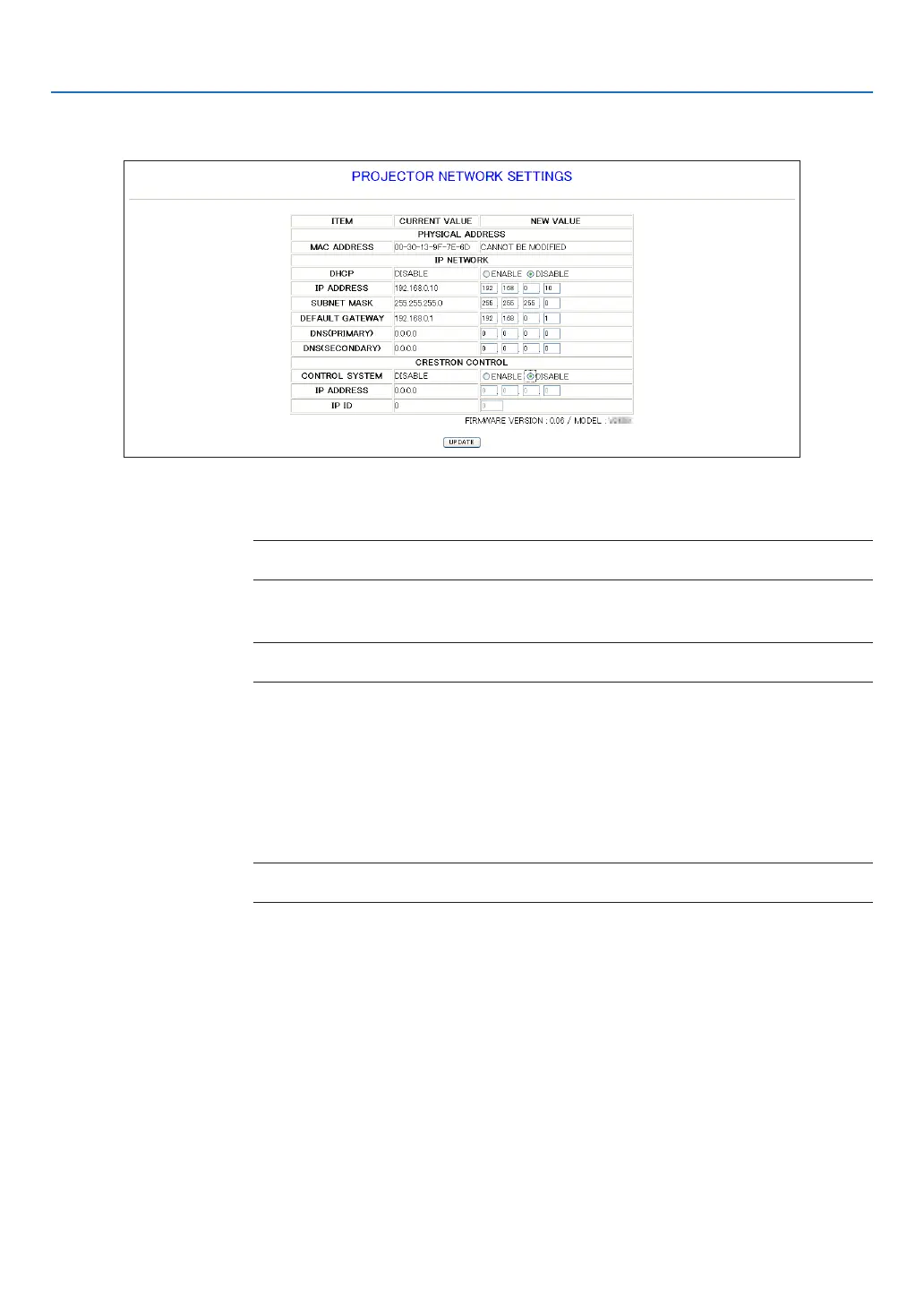 IP ADDRESS .......................Set your IP address of the network connected to the projector when [DISABLE] is selected for