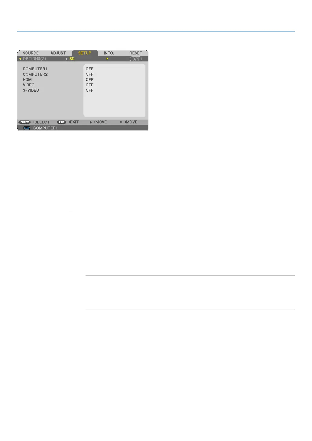 OFF ........................ Turns off the 3D mode for the selected input.