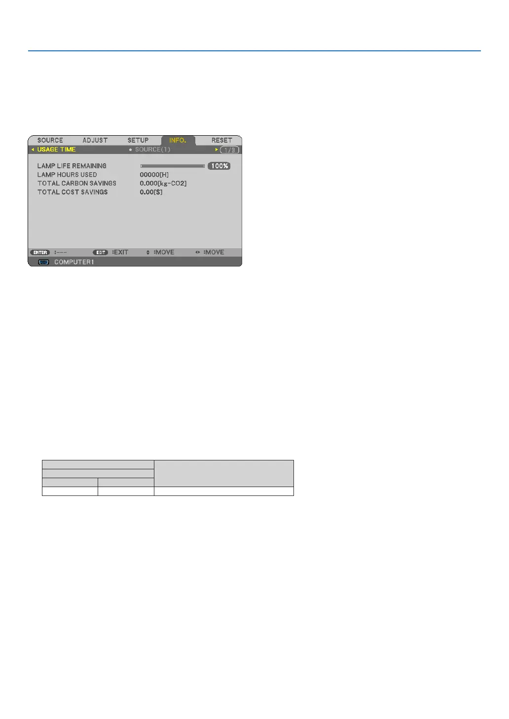 The value informs you of the amount of lamp usage. When the remaining lamp time reaches 0, the LAMP LIFE