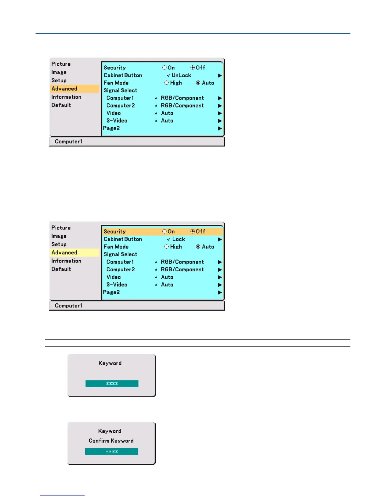 is set, turning on the projector will display the Keyword input screen. Unless the correct keyword is entered, the