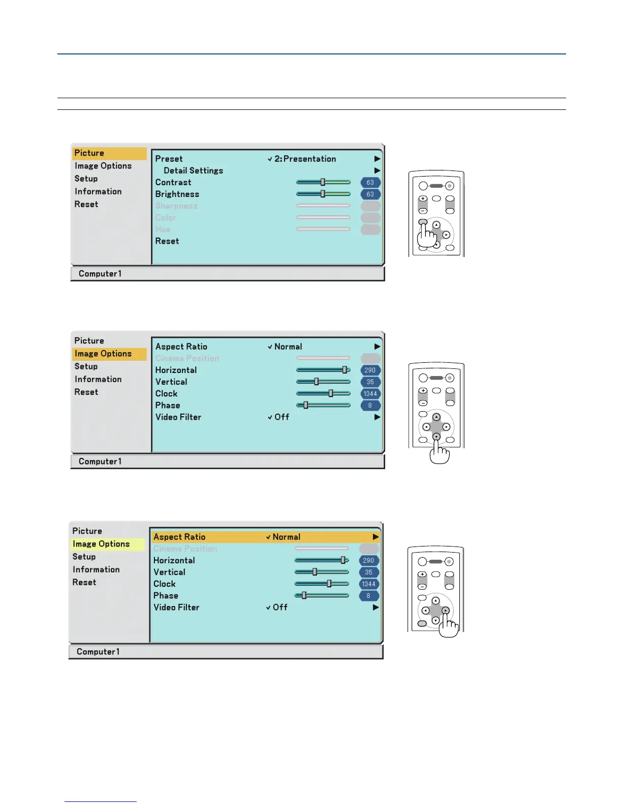 NOTE: The on-screen menu may not be displayed correctly while interlaced motion video image is projected.