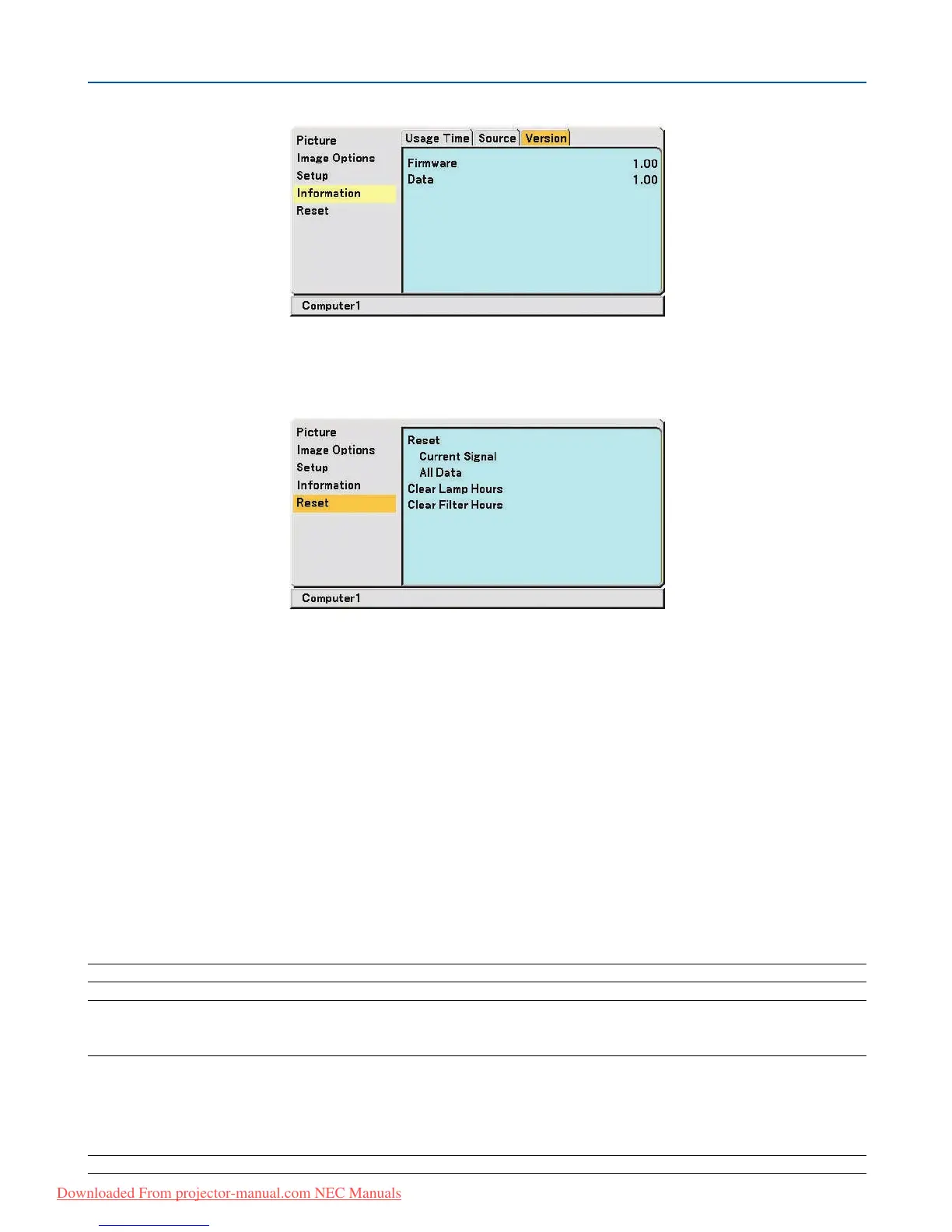 To reset the lamp usage time, see “Clearing Lamp Hour Meter [Clear Lamp Hours] below”.