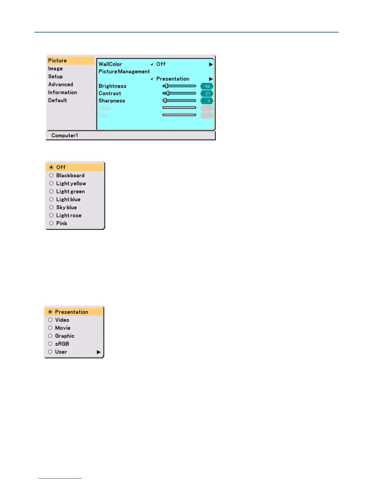 There are 5 factory presets optimized for various types of images, or you can set user adjustable settings.