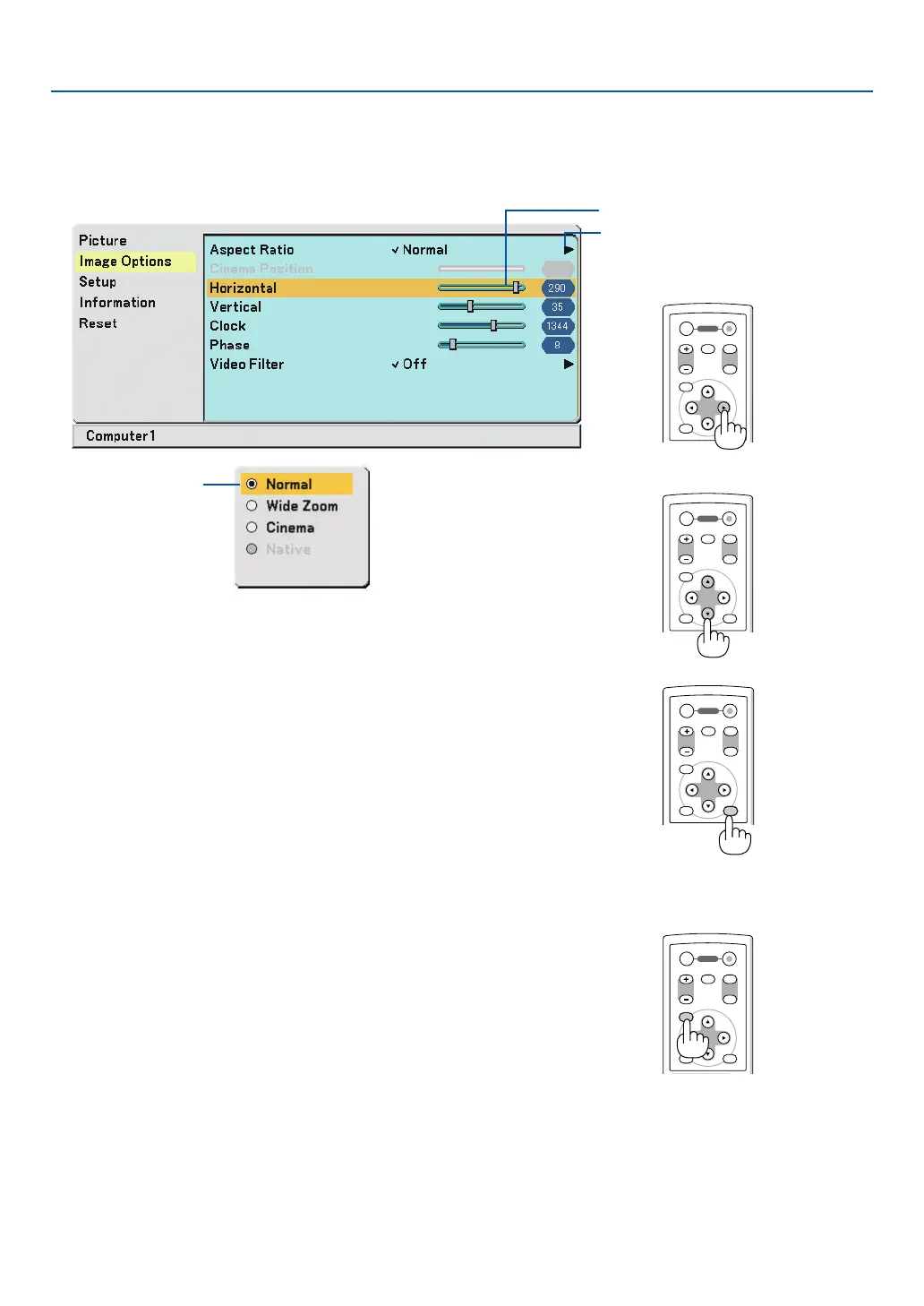 projector cabinet to select the item you want to adjust or set.