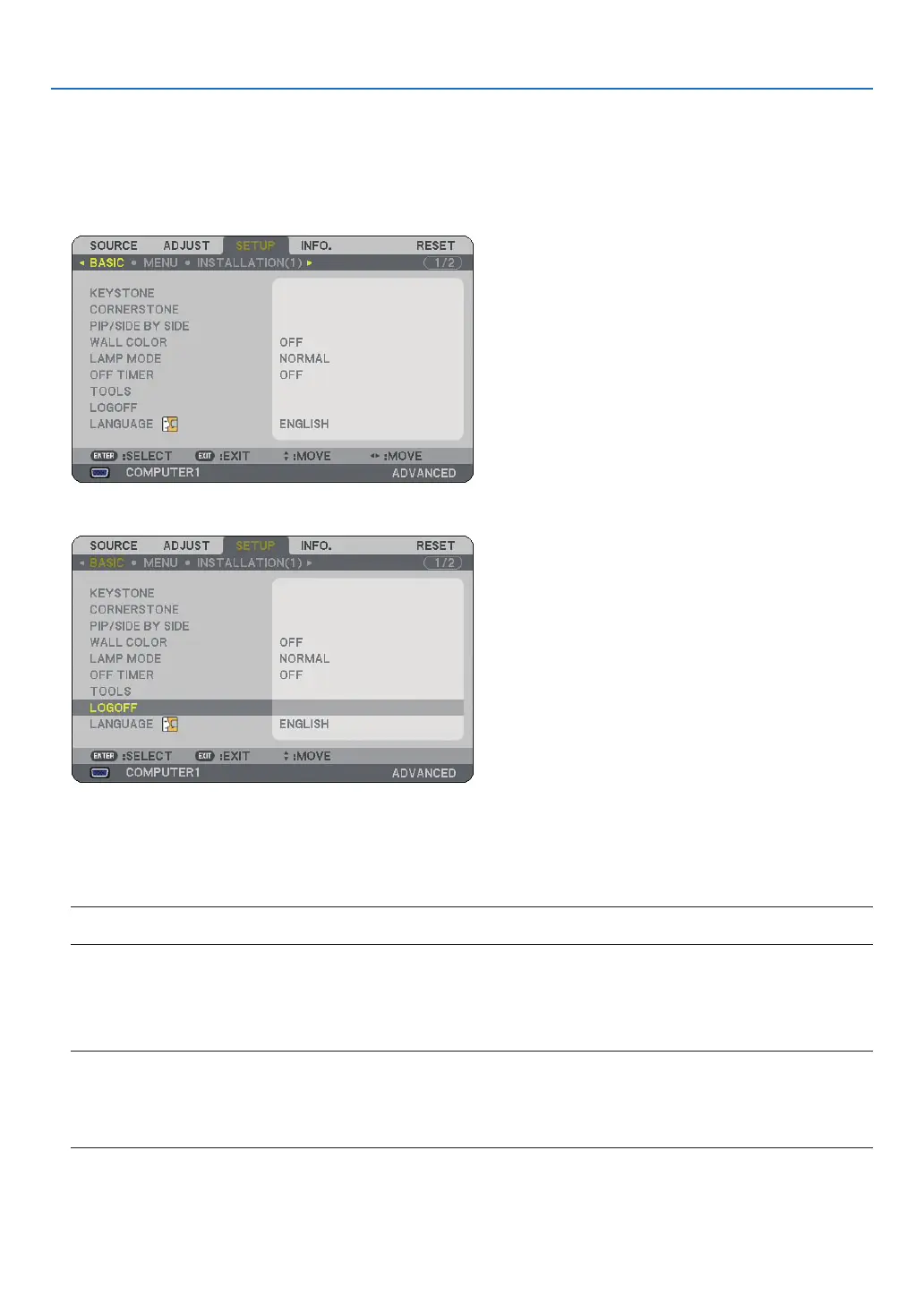 Logging off your projector will prevent an unauthorized user from operating your projector.