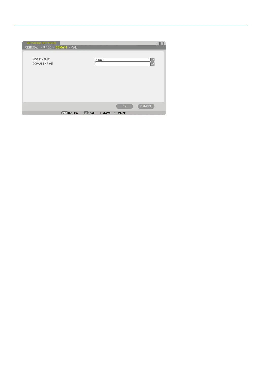 DOMAIN NAME ..... Type in domain name of the network connected to the projector. Up to 60 alphanumeric characters can
