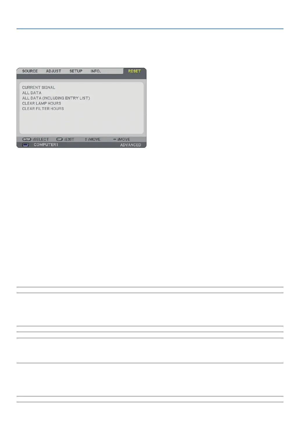 NOTE: Elapsed time of the lamp use will not be affected even when [RESET] is done from the menu.