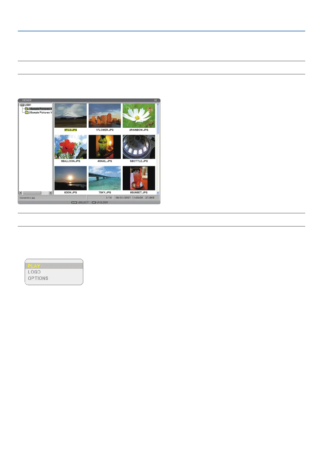 Preparation: Store JPEG or BMP les (JPEG, BMP, non-interlaced GIF or non-interlaced PNG les) in a USB