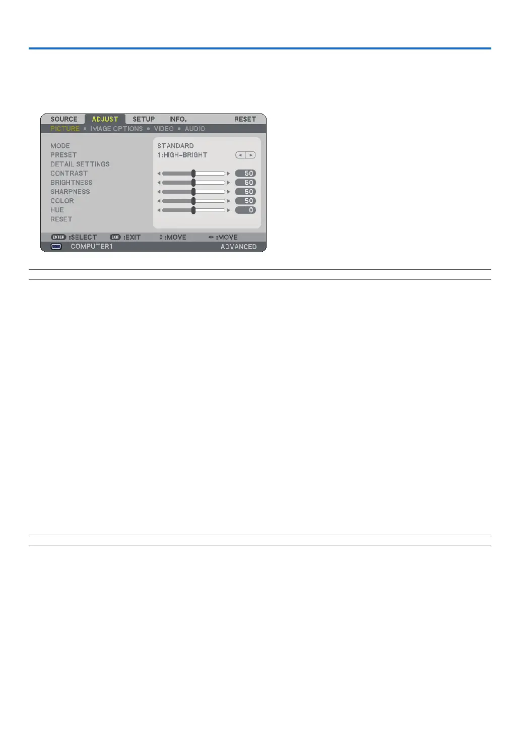 6. Adjust the level or turn the selected item on or off by using the SELECT ▲▼◀ ▶ buttons on the remote