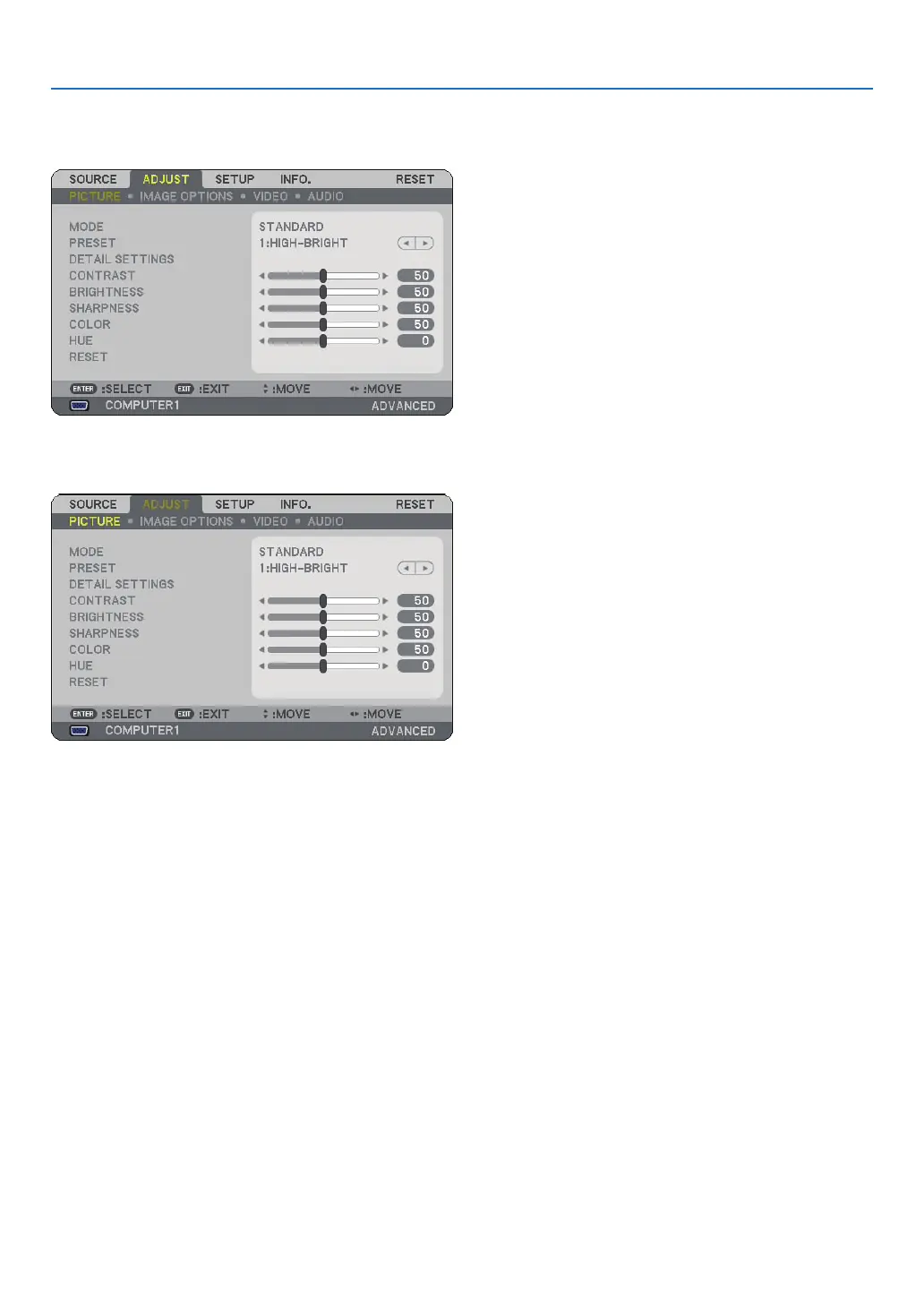 STANDARD............ Saves settings for each item of [PRESET] (PRESET 1 through 6)