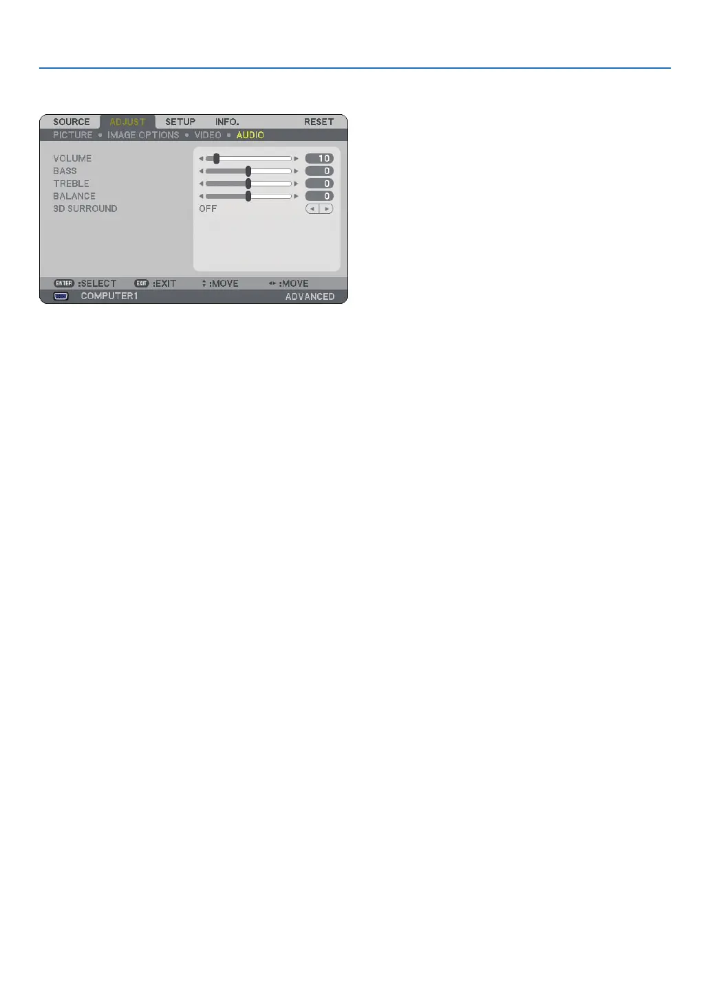 Adjusts the volume, bass and treble level, left and right balance of the projector speaker and AUDIO OUT (Stereo
