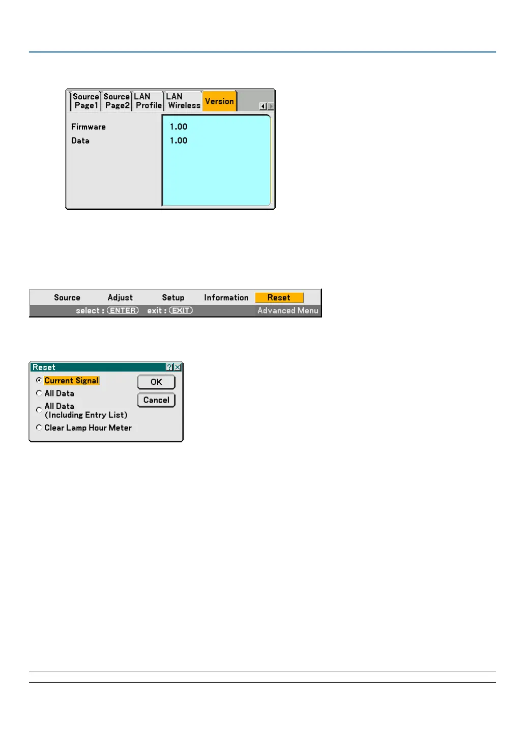 The Reset feature allows you to change adjustments and settings to the factory preset for sources by the following