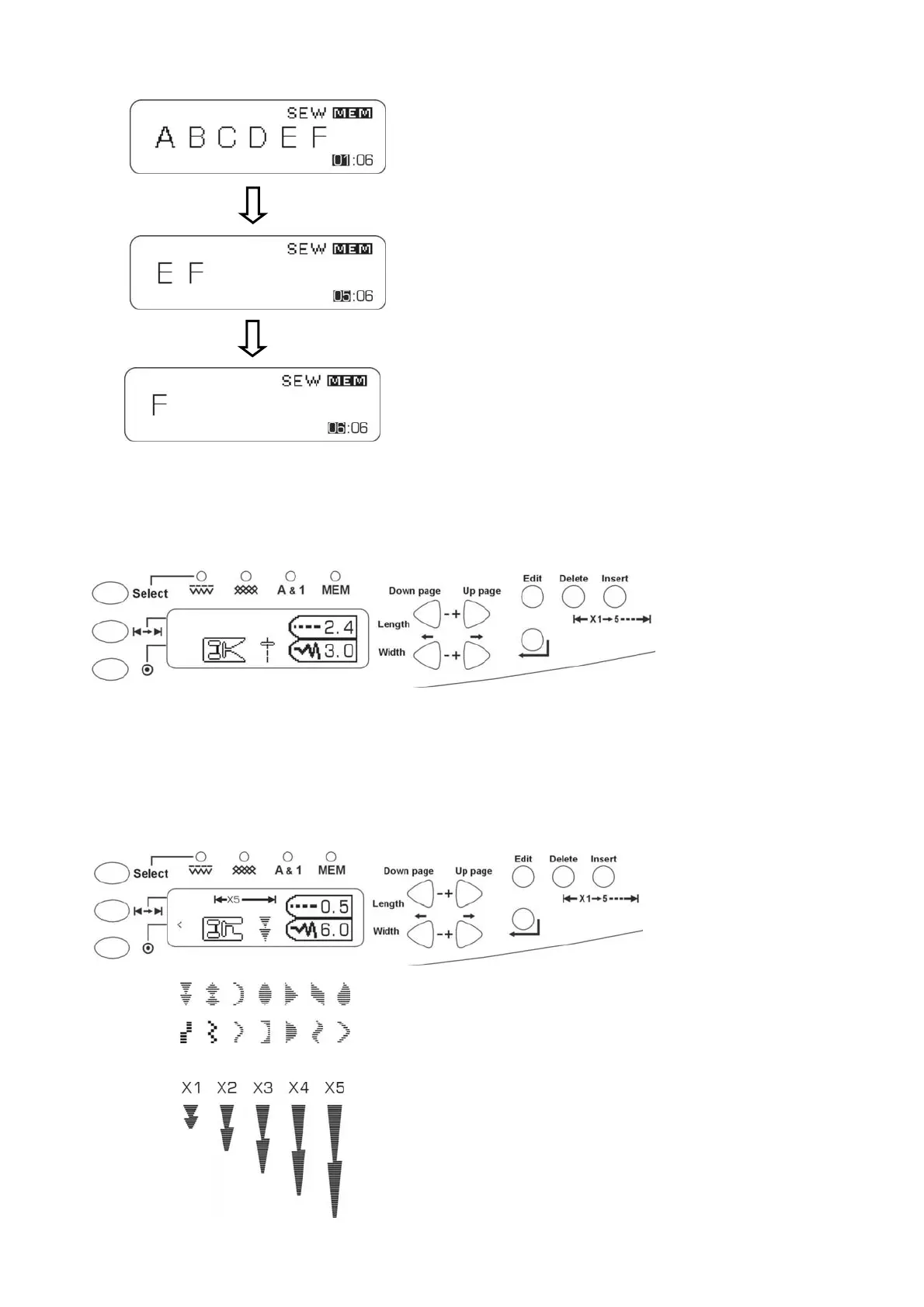 Usted puede agrandar una puntada hasta 5 veces después de que usted presione el selector de insertar “insert” para 14 tipos de puntadas.
