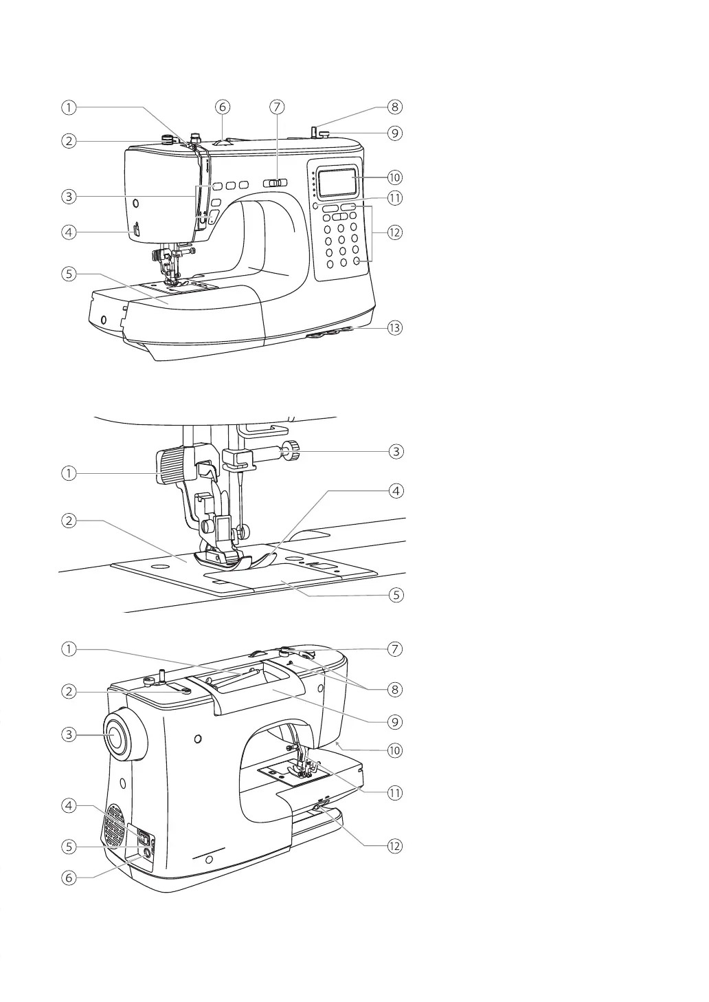 Necchi C360 - Principal Parts of the Machine; Front Overview; Needle Area Overview; Back Overview