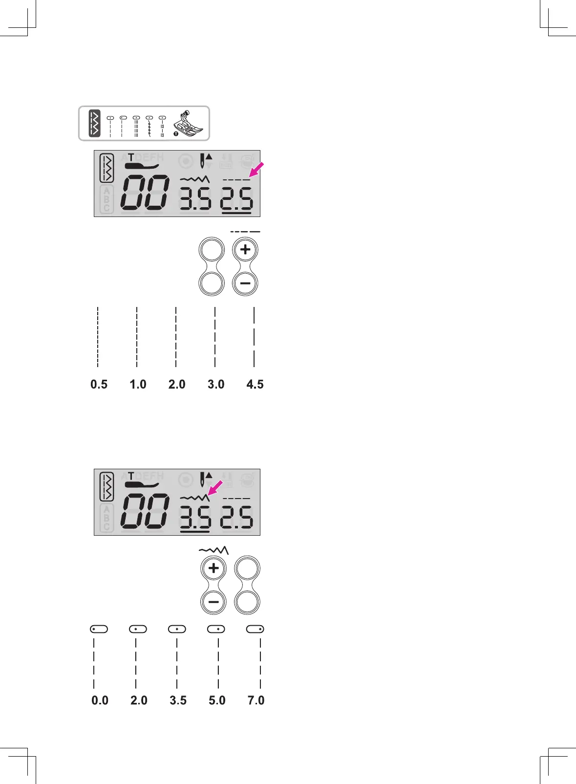 For a shorter stitch, press the "–" button. For