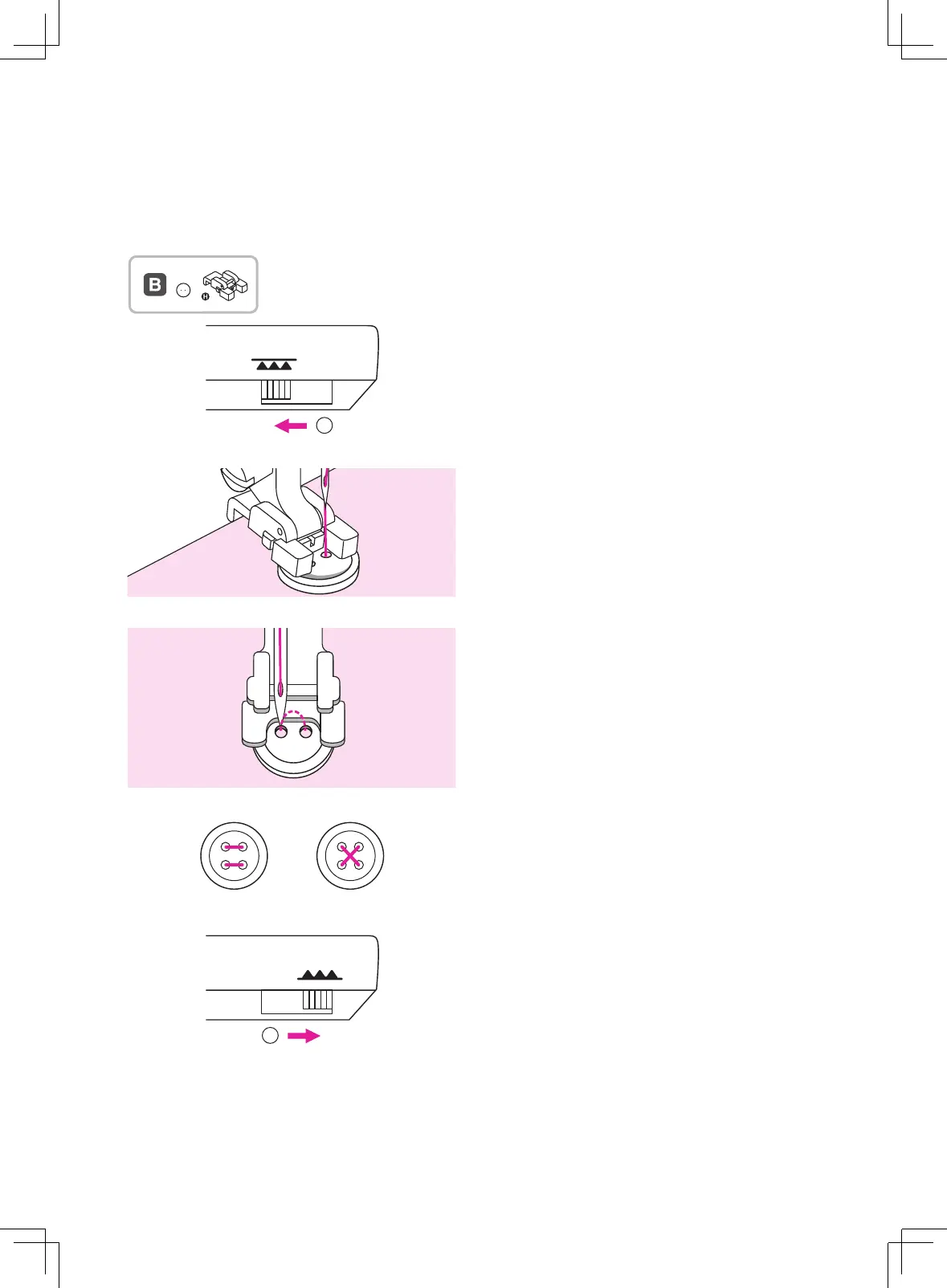 Buttons can be sewn on with the sewing machine. Buttons with 2 or 4 holes can be