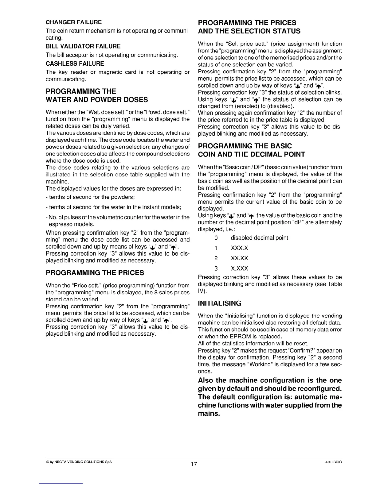 Necta BRIO - Price and Selection Configuration; Setting Prices and Selection Status