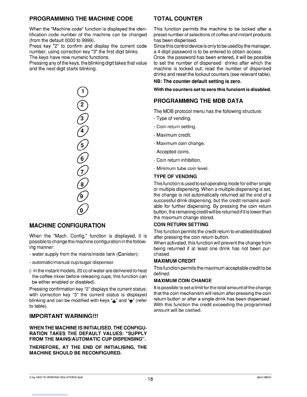 Necta BRIO - Machine Code and MDB Data Programming; Machine Configuration and MDB Protocol