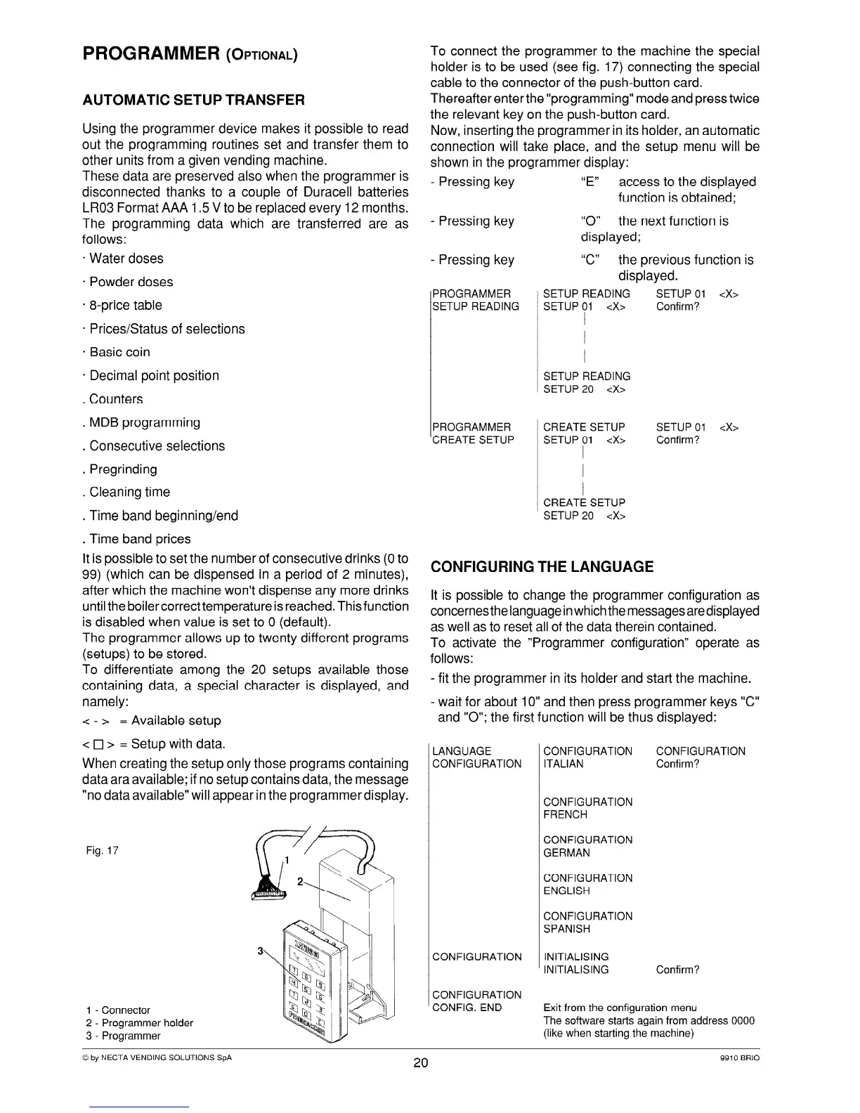 Necta BRIO - Programmer Device Usage; Automatic Setup Transfer and Programmer Operation