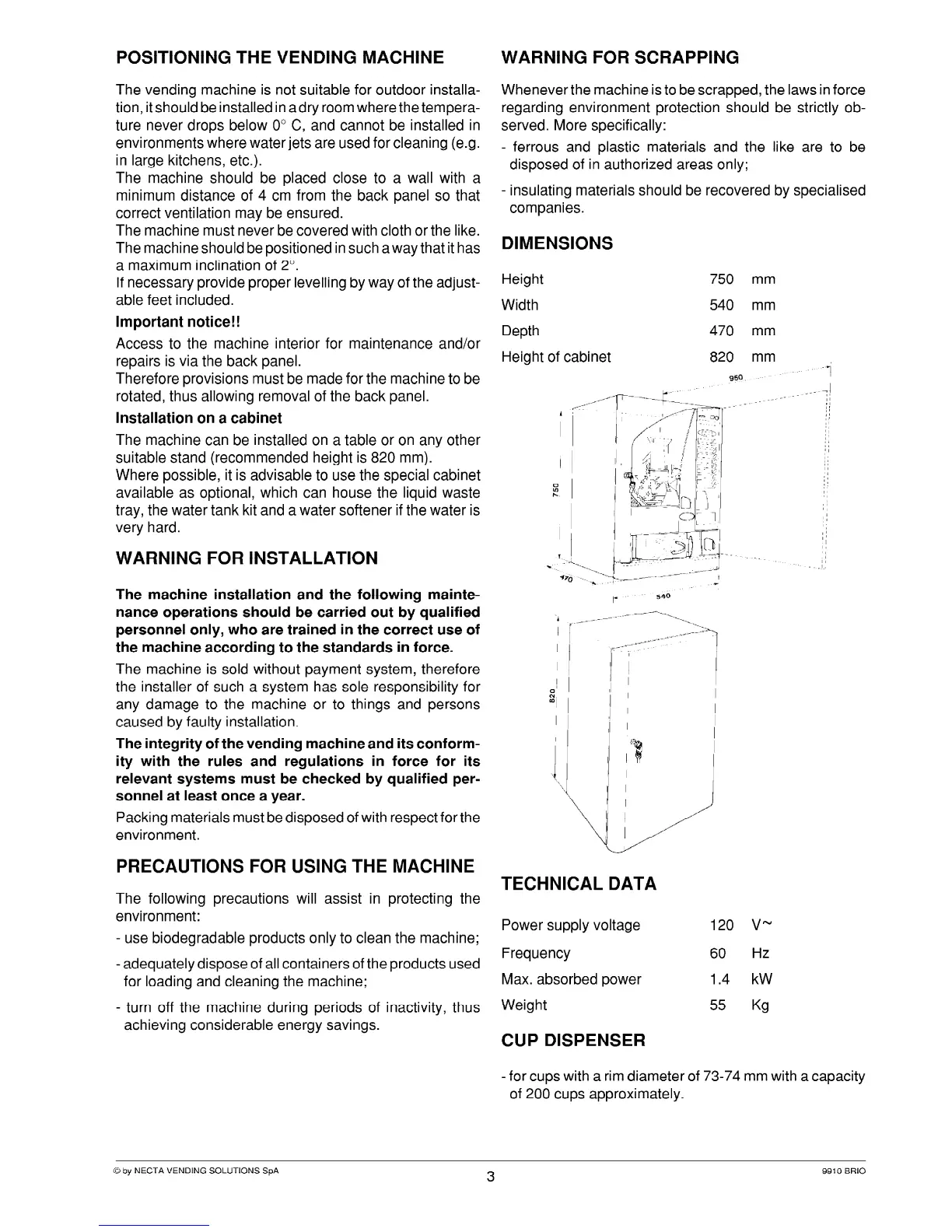 Necta BRIO - Technical Data and Specifications; Machine Dimensions and Technical Data