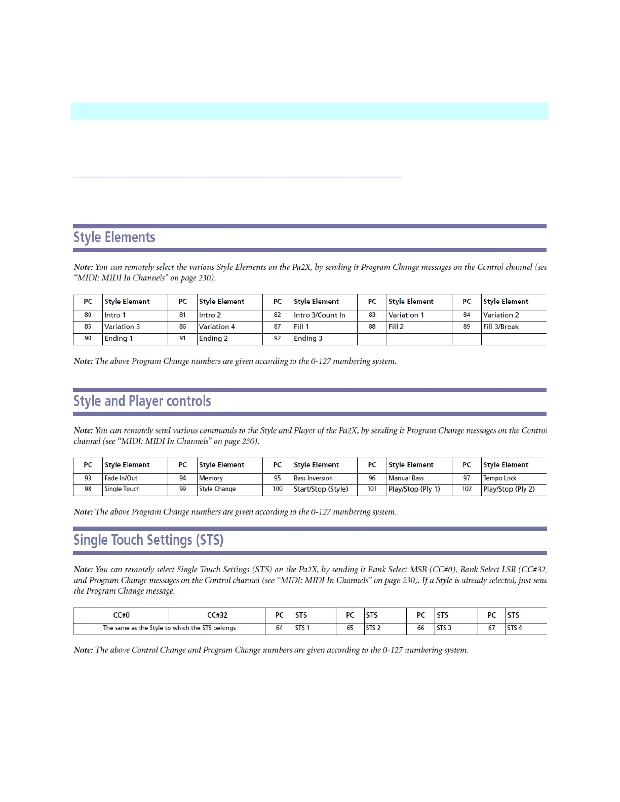 Nectar Pacer - Korg Pa2 X - Remote Control of Style Elements; Style Elements Control; Style and Player Controls; Single Touch Settings (STS) Control