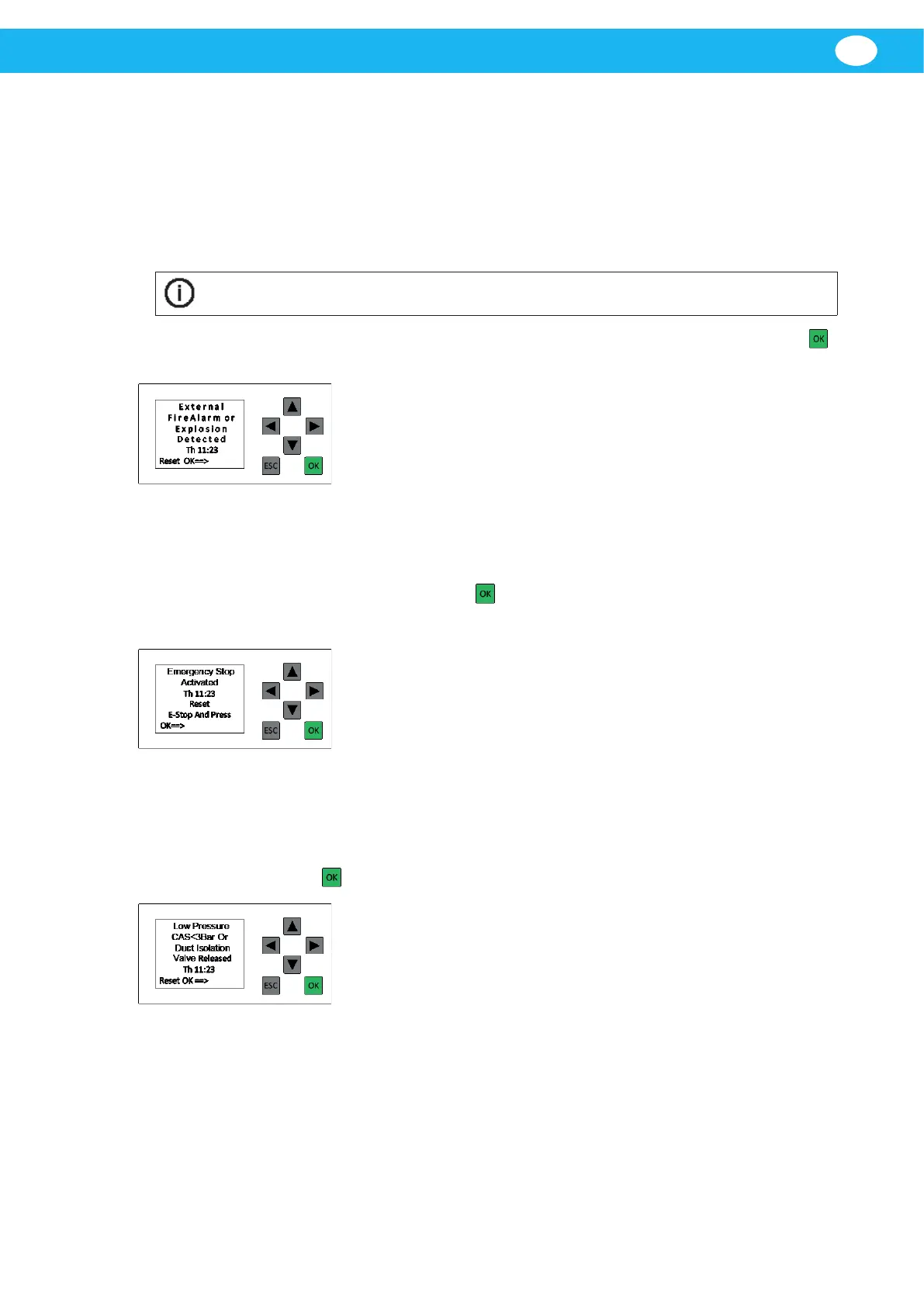 已激活外部火警或已连接泄压板传感器(RPS)并检测到爆炸。按下绿色 OK 按钮