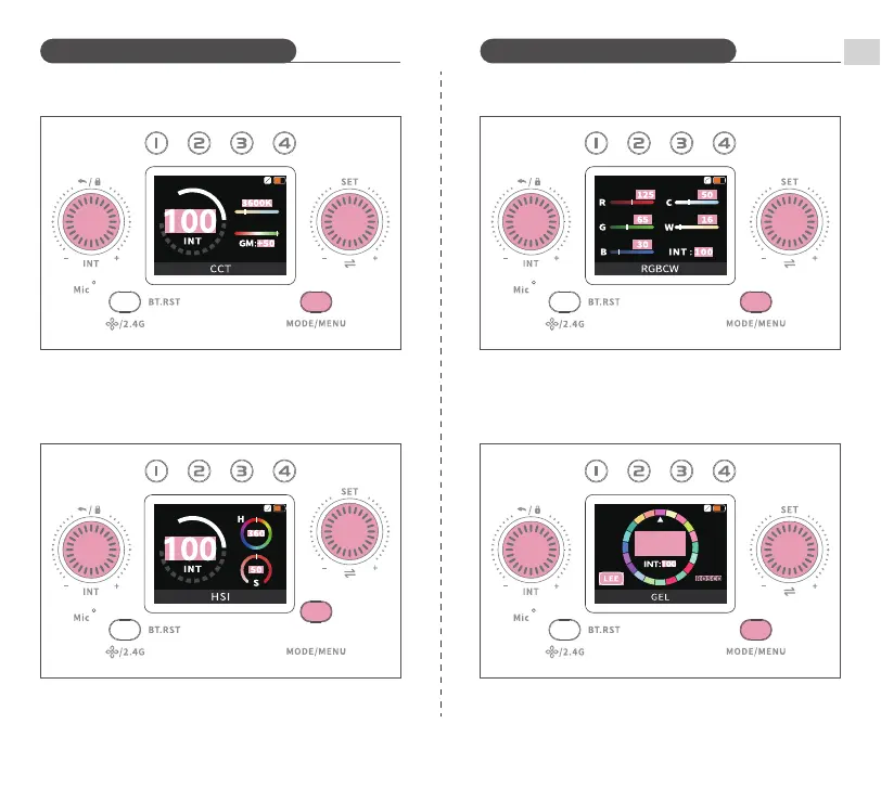 R/G/B/C/W (0~255). Turn INT Dial to adjust brightness (0~100%).