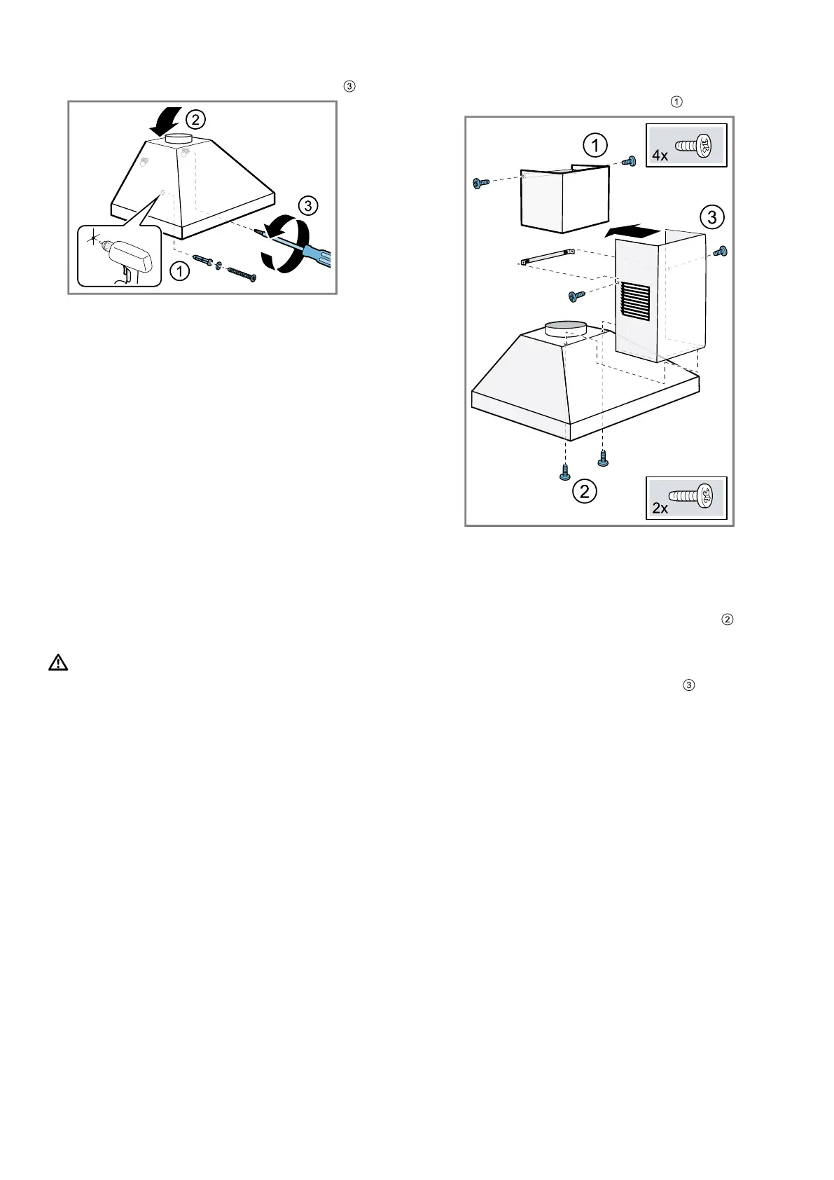 Use 2 long screws to screw the lower flue duct sec-