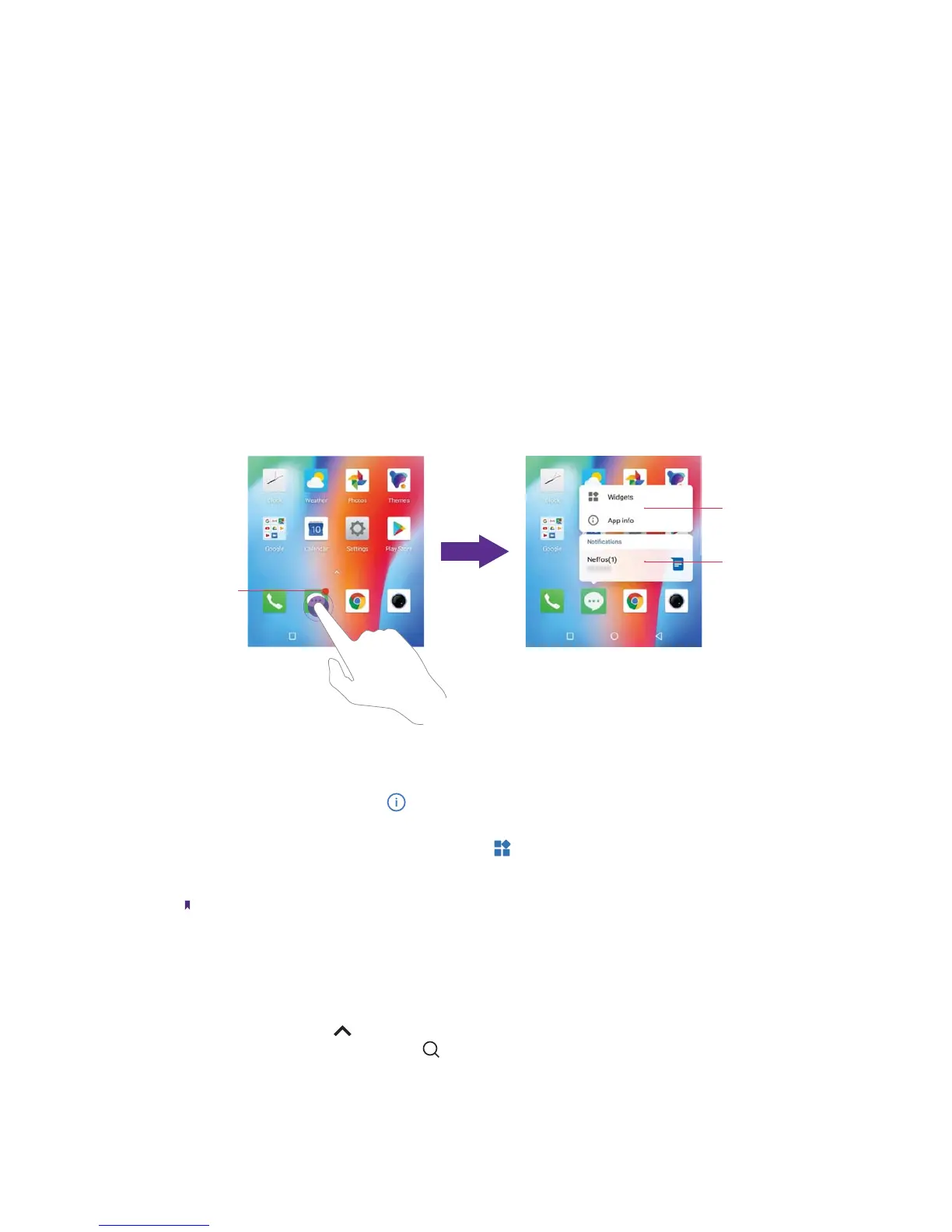 On the Home screen, touch and hold an application to open the pop up box. You can: