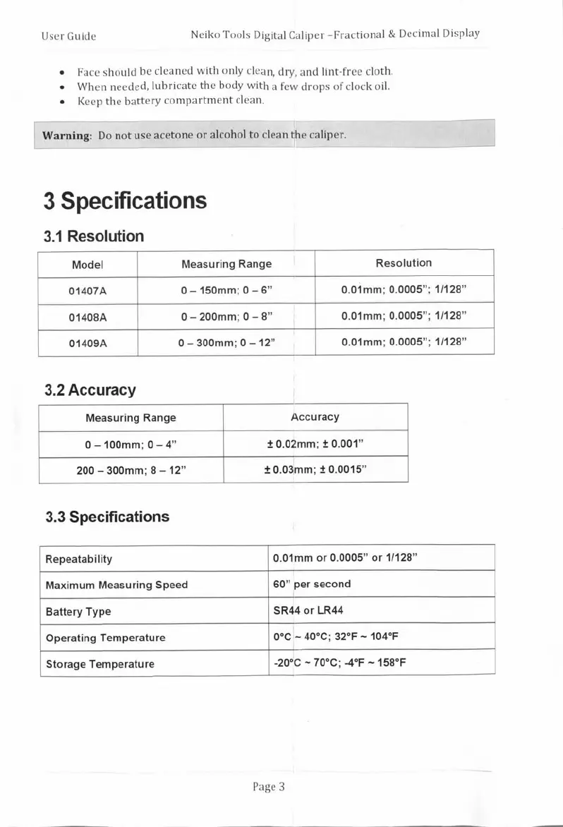 Neiko 01407A - Neiko Digital Caliper Specifications; Caliper Resolution Details; Caliper Accuracy by Measuring Range; Technical Specifications Summary