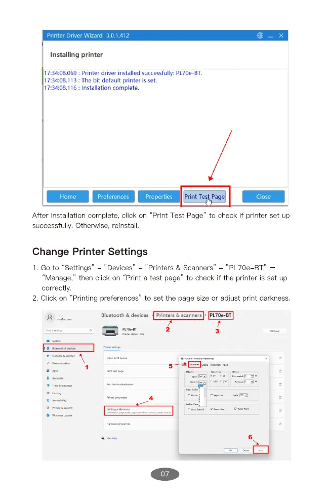 : Printer driver installed successfully:PL70e-BT.