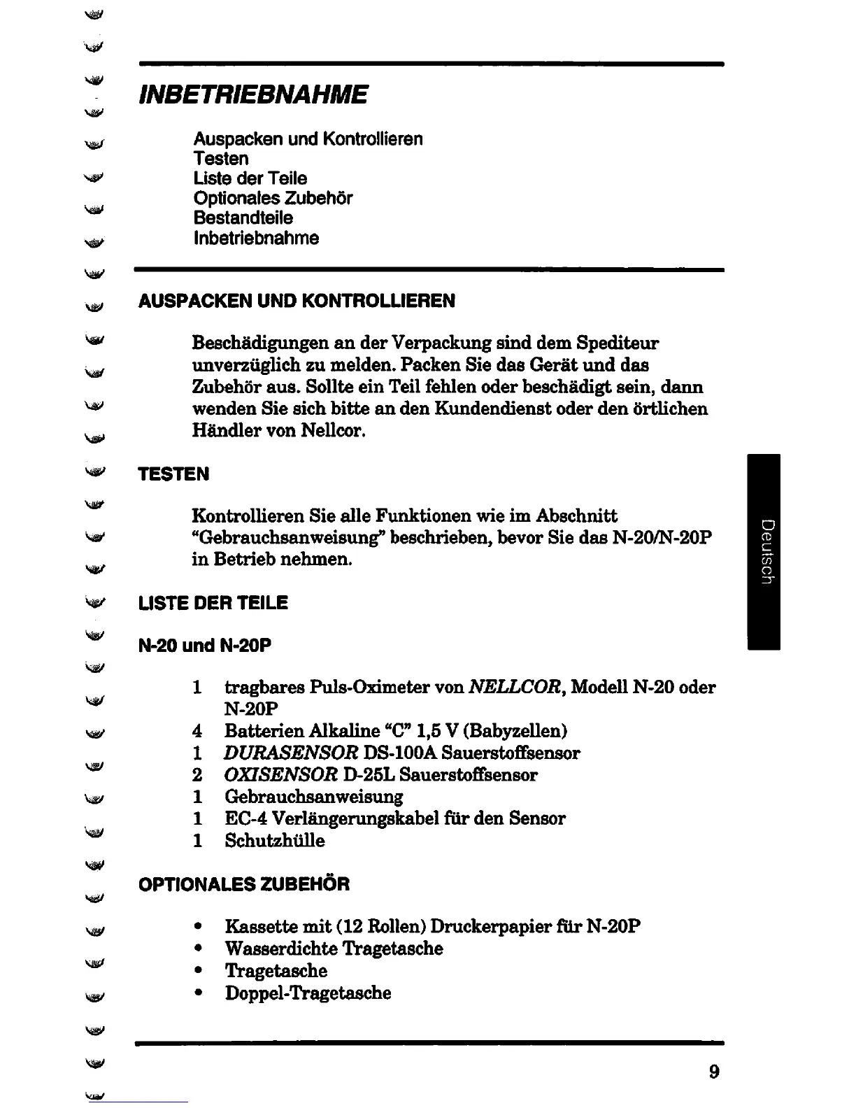 Nellcor N-20 - Inbetriebnahme; Auspacken und Kontrollieren; Testen; Liste der Teile