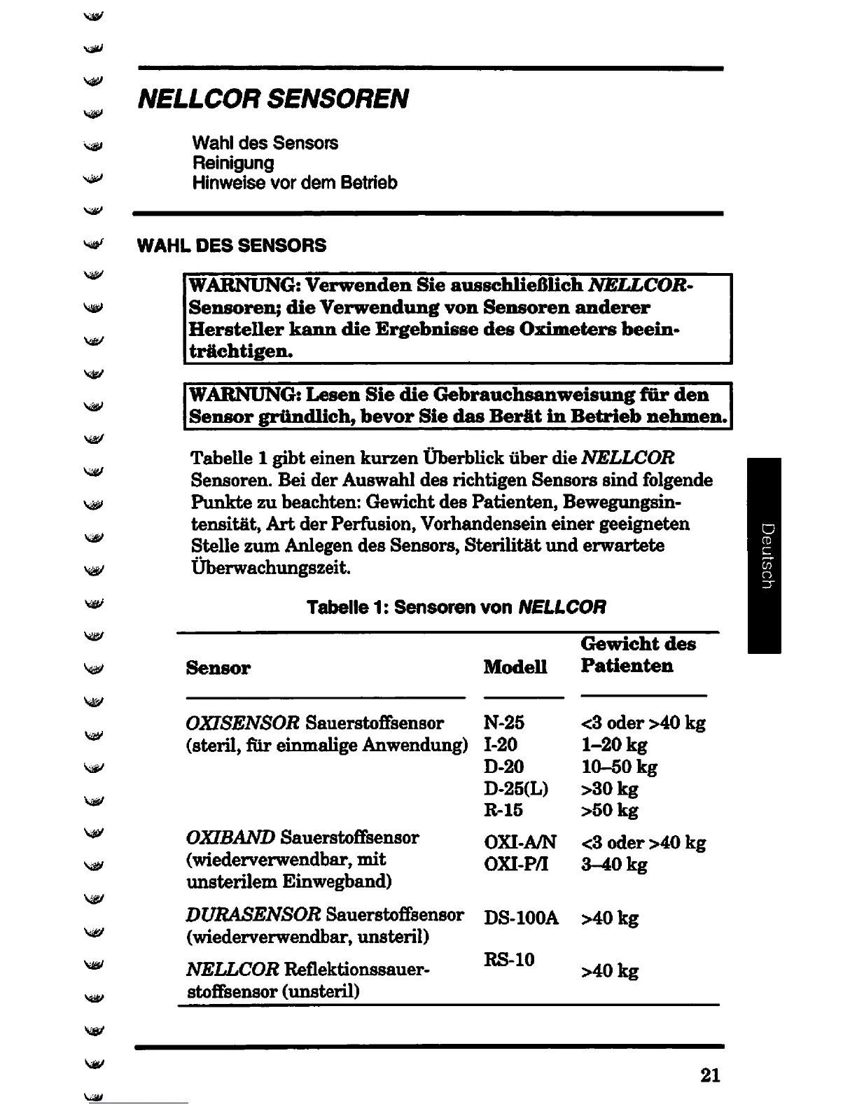 Nellcor N-20 - NELLCOR Sensoren; Wahl des Sensors