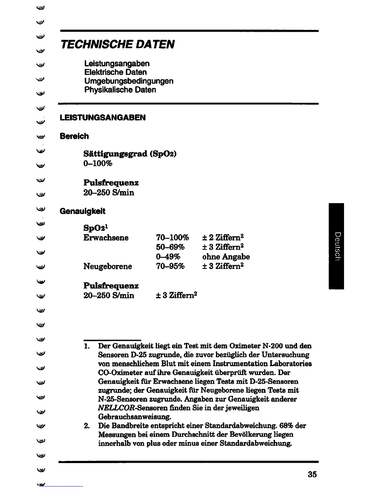 Nellcor N-20 - Technische Daten; Leistungsangaben